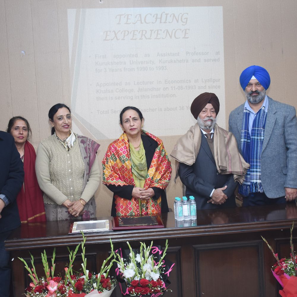 जालंधर| लायलपुर खालसा कॉलेज के अध्यापकों द्वारा कॉलेज की कार्यकारी प्रिंसीपल प्रो. नवदीप कौर को उनकी सेवानिवृत्ति के अवसर पर विदाई पार्टी दी गई। सभी विभागों के अध्यक्षों और प्रोफेसरों ने फूलों के गुलदस्ते भेंट कर प्रो. नवदीप कौर और उनके जीवनसाथी सेवानिवृत्त प्रोफेसर प्रभजोत सिंह का स्वागत किया। डॉ. रछपाल सिंह ने बताया कि कॉलेज में लगभग 33 वर्षों के कार्यकाल के दौरान प्रो. नवदीप कौर ने अर्थशास्त्र विभाग में प्रोफेसर, विभागाध्यक्ष, बर्सर, कॉलेज रजिस्ट्रार और कार्यकारी प्रिंसीपल के रूप में सराहनीय सेवाएं दीं। वहीं अर्थशास्त्र विभाग के प्रोफेसर डॉ. सिमरनजीत सिंह बैंस और अंग्रेज़ी विभाग की अध्यक्ष प्रो. बलराज कौर ने गवर्निंग काउंसिल द्वारा भेजा गया प्रशंसा पत्र प्रस्तुत किया। अध्यक्ष बलबीर कौर ने प्रो. नवदीप कौर को उनके उज्ज्वल भविष्य के लिए शुभकामनाएं दीं ।