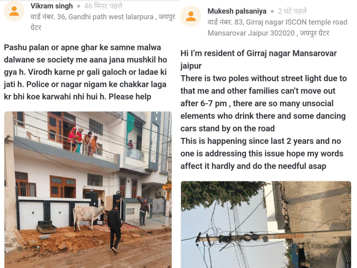 जयपुर में वार्डों में कचरे, बंद पड़ी स्ट्रीट लाइट से लोग परेशान हैं। सड़कों के बीच पेड़ कभी भी हादसे का कारण बन सकते हैं। दैनिक भास्कर के सिविक इश्यू पर रोज लोग अपनी परेशानियां पता रहे हैं। साथ ही जल्द कार्रवाई की मांग कर रहे हैं। जयपुर के अलग-अलग इलाकों से लोग लगातार अपनी सदस्याएं लिख रहे हैं। आगे पढ़िए दैनिक भास्कर के सिविक इश्यू पर आई समस्याएं… वार्ड 89 में कचरे का ढेर एम.डी. रोड स्थित वार्ड नंबर 89 की निवासी हरनूर ने बताया कि इलाके में कई दिनों से कचरे के बड़े-बड़े ढेर जमा है। सड़क किनारे फैली गंदगी से लगातार दुर्गंध उठ रही है, जिससे स्थानीय लोग परेशान है। हरनूर का कहना है कि सफाई दल को कई बार शिकायत की। लेकिन स्थायी समाधान नहीं मिला। वार्ड 38 में पेड़ से हादसे का खतरा खातीपुरा के वार्ड 38 निवासी देवा ने बताया कि सड़क के ठीक बीचों-बीच खड़ा एक पेड़ सालों से परेशानी का कारण बना हुआ है। सड़क संकरी है, पेड़ बीच में होने से दोपहिया और चारपहिया वाहनों का निकलना मुश्किल हो जाता है। देवा के अनुसार, कई बार यहां दुर्घटना होते–होते बची है। वार्ड 83 में दो साल से बंद पड़ी स्ट्रीट लाइट मानसरोवर वार्ड 83 के मुकेश ने बताया कि उनके इलाके में लगे लाइट पोल पर पिछले दो साल से रोशनी नहीं होती। शाम 6-7 बजे के बाद पूरा क्षेत्र अंधेरे में डूब जाता है। जिससे राहगीरों को परेशानी होती है। कई बार शिकायत करने के बावजूद समाधान नहीं हुआ है। वार्ड 36 में सड़क पर गंदगी से परेशान लोग गांधीपथ के वार्ड 36 निवासी विक्रम सिंह ने बताया कि कॉलोनी में रहने वाला एक व्यक्ति पशुपालन करता है और रोजाना अपने घर के सामने ही मलबा व गंदगी फेंक देता है। इससे सड़क पर कीचड़ फैल जाता है और बदबू, मच्छर व गंदगी बढ़ती जा रही है। कई बार रोकने के बाद भी वह व्यक्ति नहीं मान रहा। लेकिन प्रशासन भी इस मामले पर संज्ञान नहीं ले रहा है। आम जनता का कहना है कि बार-बार शिकायत करने पर भी सुनवाई नहीं हो रही है। ऐसे में अगर आप समय रहते हैं शासन और प्रशासन ने कार्रवाई नहीं की। तो मजबूरन हमें आंदोलन की राह पर आगे बढ़ना पड़ेगा। आप भी कर सकते हैं पोस्ट अब लोग अपनी बात सीधे दैनिक भास्कर ऐप पर रख रहे हैं। दैनिक भास्कर ऐप के ‘सिविक इश्यू’ सेक्शन में गली या मोहल्ले की समस्या लिखकर और फोटो लगाकर पोस्ट की जा सकती है। अगर आपने इस सेक्शन में किसी समस्या को लेकर पोस्ट किया और उसका समाधान हो गया है तो आप पोस्ट कर बता सकते हैं कि आपकी समस्या का समाधान हो। यहां क्लिक करें। जयपुर में सिविक इश्यू से जुड़ी ये 10 खबरें भी पढ़िए…. 1.सीवरेज चोक और टूटी पाइपलाइन से बढ़ी लोगों की परेशानी:जयपुर में दिनभर गंदा पानी फैलने की शिकायतें, दैनिक भास्कर के सिविक इश्यू पर सामने आई परेशानी 2. सड़कों पर सीव