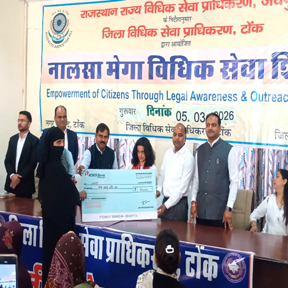 टोंक जिला मुख्यालय पर गुरुवार को जिला विधिक सेवा प्राधिकरण की ओर से नालसा मेगा विधिक जागरूकता और लोककल्याणकारी शिविर लगाया गया। वैकल्पिक विवाद निस्तारण केन्द्र में हुए इस शिविर में अलग-अलग विभागों की योजनाओं का लाभ पात्र लोगों को मौके पर दिया गया। कार्यक्रम की अध्यक्षता जिला विधिक सेवा प्राधिकरण के कार्यवाहक अध्यक्ष एवं जिला न्यायाधीश महावीर महावर और प्राधिकरण के सचिव दिनेश कुमार जलुथरिया ने की। शिविर में लोगों को 14 मार्च 2026 को होने वाली राष्ट्रीय लोक अदालत के बारे में जानकारी दी गई और बताया गया कि बिजली, पानी जैसे मामलों का निपटारा आपसी सुलह से किया जा सकता है। कृषि विभाग की ओर से किसानों को रोटावेटर और चापकटर दिए गए। महिला एवं बाल विकास विभाग की ओर से प्रधानमंत्री मातृ वंदना योजना के तहत लाभार्थियों को 5000 रुपए के चेक दिए गए। दीप जलाकर कार्यक्रम की शुरुआत की गई