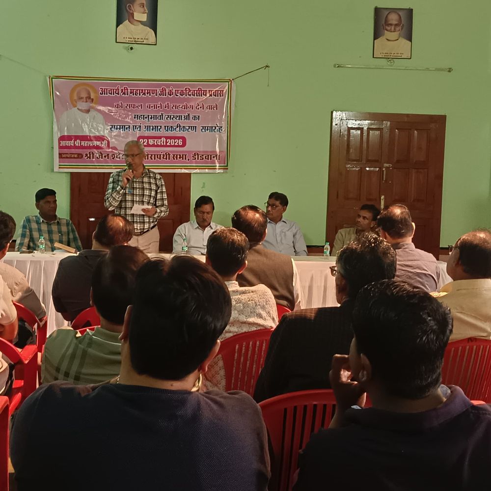 डीडवाना के स्थानीय जैन भवन में शांतिदूत आचार्य महाश्रमण के एक दिवसीय प्रवास की सफलता पर ‘आभार प्रकटीकरण एवं सम्मान समारोह’ आयोजित किया गया। इस कार्यक्रम का मुख्य उद्देश्य प्रवास को सफल बनाने में सहयोग देने वाली विभिन्न सामाजिक संस्थाओं और गणमान्य नागरिकों के प्रति कृतज्ञता व्यक्त करना था। समारोह में केवल जैन समाज ही नहीं, बल्कि शहर के विभिन्न धर्मों और वर्गों के प्रतिनिधियों ने भी भाग लिया। वक्ताओं ने आचार्यश्री के प्रवास के दौरान अनुभव किए गए आध्यात्मिक वातावरण, उनके मानवतावादी संदेश और सद्भावना के विचारों को साझा किया। उन्होंने इस प्रवास को शहर के लिए प्रेरणादायक बताया। इस अवसर पर, प्रवास की व्यवस्थाओं में सहयोग देने वाली सामाजिक संस्थाओं के पदाधिकारियों और समाजसेवियों को सम्मानित किया गया। उन्हें दुपट्टा ओढ़ाकर और स्मृति चिन्ह भेंट कर कृतज्ञता व्यक्त की गई।