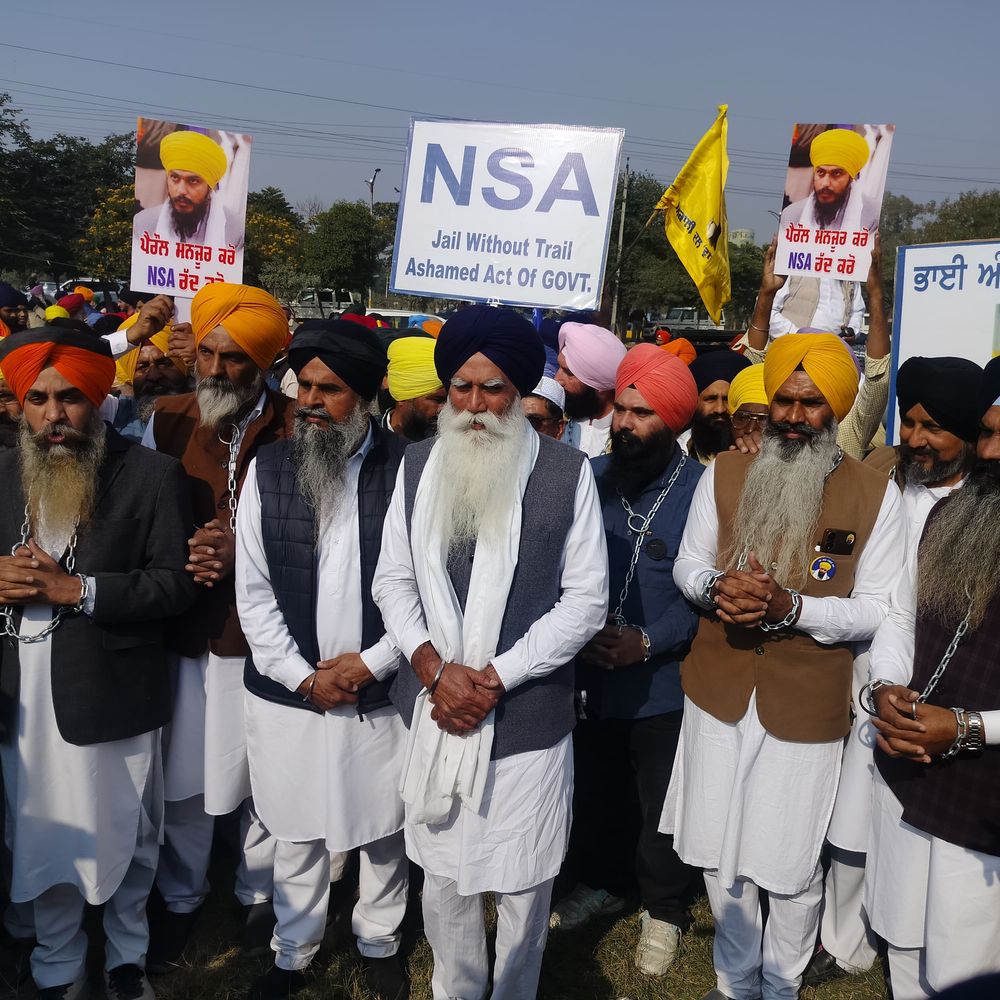 तरनतारन में गले में जंजीरें डालकर एक बड़ा विरोध मार्च और धरना प्रदर्शन किया गया। प्रदर्शनकारियों ने अमृतपाल सिंह की पैरोल रद्द करने के फैसले का विरोध किया। इस दौरान डीसी को एक ज्ञापन सौंपा गया, जिसमें भारत के राष्ट्रपति, लोकसभा स्पीकर और पंजाब के राज्यपाल से तत्काल हस्तक्षेप और न्याय की मांग की गई। सांसद भाई अमृतपाल सिंह खालसा दो साल से अधिक समय से डिब्रूगढ़ जेल में बंद हैं। उन्हें न तो रिहा किया जा रहा है और न ही संसद में एक सांसद के तौर पर बोलने की अनुमति दी जा रही है। प्रदर्शनकारियों ने आरोप लगाया कि पहले उन पर राष्ट्रीय सुरक्षा कानून (NSA) लगाकर उन्हें पंजाब से बाहर भेजा गया। इसके बाद मुख्यमंत्री भगवंत मान ने कथित तौर पर राजनीतिक बदले की भावना से लगातार तीन बार NSA की अवधि बढ़ाई। उनका कहना है कि अमृतपाल के बाहर आने से पंजाब का माहौल खराब हो जाएगा, यह सरकार की ऐसी मानसिकता दर्शाता है जो लोकतांत्रिक अधिकारों का हनन करना चाहती है। सबसे गंभीर बात यह है कि पंजाब सरकार ने दिल्ली संसद में बोलने के लिए दायर की गई उनकी पैरोल याचिका को भी यह कहकर खारिज करवा दिया कि अगर अमृतपाल जेल से बाहर आए तो पंजाब का माहौल खराब हो जाएगा। इस अवसर पर बोलते हुए बापू तरसेम सिंह ने कहा कि एक चुने हुए प्रतिनिधि को संसद में बोलने की अनुमति न देना लोकतांत्रिक अधिकारों का उल्लंघन है। उन्होंने जोर देकर कहा कि आज का विरोध मार्च और धरना पंजाब सरकार को यह बताने के लिए है कि लोगों की आवाज को न तो दबाया जा सकता है और न ही मिटाया जा सकता है।