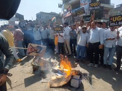 दौसा में UGC के नए नियमों के विरोध में बड़ी संख्या में युवाओं ने सिर पर काली पट्टी बांधकर प्रदर्शन किया। भाजपा के झंडे जलाए और नेताओं के पुतले फूंके। आक्रोश रैली में केंद्र सरकार विरोधी नारे लिखी तख्तियां हाथों में लेकर प्रदर्शनकारी कलेक्ट्रेट पहुंचे। पुलिस ने बैरिकेडिंग कर प्रदर्शनकारियों को कलेक्ट्रेट गेट पर रोक दिया। जयपुर-आगरा हाईवे जाम करने के लिए लोग आगे बढ़े तो पुलिस से धक्का-मुक्की हो गई। इस दौरान कुछ युवाओं ने हाईवे पर पहुंचकर जाम करने का प्रयास किया। पुलिस ने उन्हें खदेड़कर ट्रैफिक सुचारू करवाया। समझाइश के बाद मामला शांत हुआ, लेकिन प्रदर्शनकारियों ने चेतावनी दी कि यदि यूजीसी विनियम-2026 को वापस नहीं लिया गया तो आंदोलन को और उग्र किया जाएगा। कलेक्ट्रेट गेट पर बैरिकेडिंग कर रास्ता रोका यूजीसी विनियम-2026 के विरोध बुधवार को जिला मुख्यालय पर दोपहर 12 बजे सहजनाथ महादेव मंदिर से आक्रोश रैली की शुरुआत हुई। रैली कलेक्ट्रेट तक पहुंची, जहां बड़ी संख्या में लोग एकत्रित हुए। रैली में शामिल प्रदर्शनकारी सिर पर काली पट्टियां बांधे हुए थे और हाथों में केंद्र सरकार विरोधी नारे लिखी तख्तियां लिए ‘यूजीसी रोल बैक’ के नारे लगाते हुए आगे बढ़ रहे थे। भीड़ को देखते हुए डिप्टी एसपी धर्मेंद्र शर्मा के नेतृत्व में भारी पुलिस जाब्ता तैनात किया गया था। कलेक्ट्रेट के गेट समेत जगह-जगह बैरिकेडिंग कर सुरक्षा व्यवस्था मजबूत की गई। गांधी तिराहे पर पुतला दहन रैली जब गांधी तिराहे पर पहुंची तो कुछ युवाओं ने भाजपा के 16 नेताओं के पुतले जलाए। इस दौरान भाजपा के झंडों में भी आग लगाई गई और केंद्र सरकार के खिलाफ जमकर नारेबाजी की गई। मौके पर मौजूद पुलिस बल ने स्थिति पर नजर बनाए रखी। हाईवे की तरफ बढ़ने से रोकरने पर बढ़ा तनाव कलेक्ट्रेट पहुंचने पर प्रदर्शनकारियों ने जोरदार नारेबाजी की। इसी दौरान दर्जनों युवा जयपुर-आगरा नेशनल हाईवे की ओर बढ़ने लगे। पुलिस ने उन्हें रोकने का प्रयास किया, जिससे धक्का-मुक्की की स्थिति बन गई। कुछ समय तक गहमागहमी रही और कई युवक हाईवे पर जा पहुंचे, जिससे यातायात प्रभावित हुआ। पुलिस ने खदेड़ा, समझाइश से शांत हुआ मामला हाईवे जाम करने पहुंचे युवाओं को पुलिस बल ने वापस कलेक्ट्रेट के सामने की ओर धकेला। इस दौरान पुलिस और प्रदर्शनकारियों के बीच तीखी नोकझोंक भी हुई। एक युवक को धक्का लगने पर प्रदर्शनकारियों ने नाराजगी जताई और अधिकारियों से आपत्ति दर्ज कराई। हालांकि बाद में प्रशासन की समझाइश के बाद मामला शांत हो गया। केंद्र सरकार पर साधा निशाना कलेक्ट्रेट के बाहर आयोजित सभा में वक्ताओं ने कहा कि प्रस्तावित नियमों का दुरुपयोग होने पर सामान्य वर्ग के छात्रों को परेशानी का सामना क