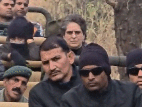 सांसद प्रियंका गांधी ने गुरुवार को अपने परिवार के साथ सवाई माधोपुर के रणथम्भौर नेशनल पार्क में सफारी की। इस दौरान प्रियंका गांधी की जिप्सी के सामने टाइगर आ गया। जैसे ही टाइगर झाड़ियों से निकला टूरिस्ट सहम गए। टाइगर जब आगे बढ़ा तो खड़े होकर वीडियो बना रहे पर्यटक डर कर अपनी सीटों पर बैठ गए। टूरिस्ट की जिप्सियों के सामने से टाइगर टहलते हुए कच्चा रास्ता पार कर झाड़ियों में ओझल हो गया। इस अद्भुत नजारे को पर्यटकों ने अपने कैमरे में कैद कर लिया। गौरतलब है कि प्रियंका गांधी अपने भाई राहुल गांधी और परिवार के साथ 30 दिसंबर को चार दिन के दौरे पर रणथंभौर पहुंची हैं। उन्होंने आज रणथंभौर में टाइगर सफारी का लुत्फ उठाया। 5 जिप्सियों में वाड्रा परिवार