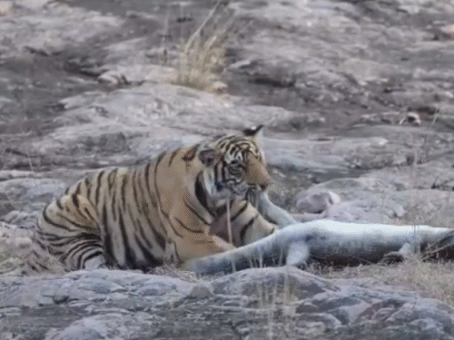 सवाई माधोपुर के रणथंभौर टाइगर रिजर्व में रविवार को 7 साल की बाघिन टी-111 (शक्ति) ने मगरमच्छ का शिकार किया। घटना सुबह की सफारी के दौरान जोन नंबर 4 के जामुन देह क्षेत्र में करीब 9 बजे हुई। बाघिन तालाब के किनारे घात लगाकर बैठी हुई थी। जैसे ही मगरमच्छ तालाब के किनारे आया, वह उस पर टूट पड़ी और जबड़े में कसकर दबोच लिया। मगरमच्छ को संभलने का मौका तक नहीं मिला। करीब 10 मिनट तक बाघिन और मगरमच्छ के बीच संघर्ष चला, जिसमें मगरमच्छ मारा गया। बाघिन उसे खींचकर चट्टानों पर ले गई। पर्यटकों ने इसका वीडियो बना लिया। इसमें बाघिन के जबड़े में मगरमच्छ दबा हुआ दिखाई दे रहा है। करीब दो दशक पहले शक्ति की नानी बाघिन ‘मछली’ ने भी मगरमच्छ का शिकार किया था। तब वह अपने शावकों को बचाने के लिए मगरमच्छ से भिड़ गई थी। मिनटों में मगरमच्छ को मार डाला था। उसे ‘लेडी ऑफ लेक’, ‘क्रोकोडाइल किलर’ नाम भी दिया गया था। वह देश की पहली बाघिन थी, जिसके नाम पर भारत सरकार ने डाक टिकट तक जारी किया था। 2016 में मछली की मौत हो गई थी। शक्ति, मछली की बेटी कृष्णा (टी-19) की संतान है। शक्ति की फरवरी, 2023 में मौत हुई थी। अब देखिए शिकार की 4 PHOTOS… पर्यटक रह गए हैरान मगरमच्छ को पानी का सबसे खतरनाक शिकारी माना जाता है, लेकिन यहां बाघिन से संघर्ष में वह मारा गया। पर्यटक भी बाघिन की फुर्ती देखकर हैरान रह गए। नजारा बेहद रोमांचकारी था, क्योंकि आमतौर पर बाघ भारी-भरकम मगरमच्छ का शिकार कम करते हैं। रणथंभौर में 60 फीसदी मछली का वंश रणथंभौर में बाघिन मछली का कुनबा सबसे ज्यादा है। मछली ने कुल 11 शावकों को जन्म दिया था। इनमें सात मादा और चार नर शावक शामिल थे। मछली की आखिरी मादा संतान बाघिन कृष्णा थी। राज्य के अन्य टाइगर रिजर्व में भी मछली के ही वंश के हैं। …… यह खबर भी पढ़िए… रणथंभौर में बाघिन ऐरोहेड ने किया मगरमच्छ का शिकार:तालाब के किनारे घात लगाकर बैठी थी, 10 मिनट में जबड़े में दबोचकर ले गई रणथंभौर टाइगर रिजर्व में बाघिन टी-84 ऐरोहेड ने मगरमच्छ का शिकार किया। मगरमच्छ तालाब से तालाब से बाहर आया था। किनारे पर पहले से घात लगाकर बैठी बाघिन टी-84 ऐरोहेड मगरमच्छ पर टूट पड़ी और उसको जबड़े में दबोच लिया। पूरी खबर पढ़िए