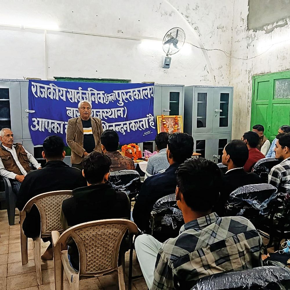 भार्गशीर्ष शुक्ल एकादशी राजकीय सार्वजनिक जिला पुस्तकालय बारां में श्रीमद् भागवत गीता ग्रंथ का सामूहिक रूप से पूजन अर्चन कर संगोष्ठी का शुभारंभ किया। पंडित सुरेशचंद्र शर्मा, सेवानिवृत संयुक्त निदेशक पशुधन विभाग डॉ. मधुकांत दुबे, पेंशनर वरिष्ठ लिपिक कैलाशचंद जैन, भाजपा नेता रमेशचंद मीणा, पुस्तकालयाध्यक्ष रामेश्वर प्रसाद मीणा, सेवानिवृत पुस्तकालय प्रभारी रामेश्वर गौतम, परामर्शदाता हरीश नागर, शिक्षार्थी बालिका ईशिका शर्मा ने श्रीमद् गीता को चारों पुरुषार्थ पूर्ण करने वाला जीवन के हर क्षेत्र में मार्ग दर्शक ग्रंथ बताया। राजा राम मोहन राय पुस्तकालय प्रतिष्ठान कोलकात्ता द्वारा स्वीकृत सहायता राशि 2 लाख 8 हजार से प्राप्त फर्नीचर सामग्री ग्लास डोर अलमारी 10 नग, कुशन चेयर 30 नग, ऑफिस टेबल, रिवॉल्विंग चेयर, डेजर्ट कूलर 2 नग का पुस्तकालय में लोकार्पण किया।