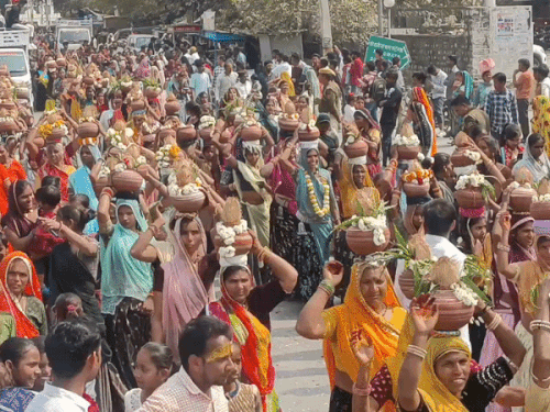 गंभीरी और बेड़च नदी के संगम पर स्थित संगम महादेव मंदिर में चल रहे शिवरात्रि मेले के तीसरे दिन विराट हिन्दू सम्मेलन का आयोजन हुआ। आयोजन की शुरुआत कलश यात्रा और शोभायात्रा से हुई। इसके लिए सुबह से ही श्रद्धालु पावटा चौक क्षेत्र में एकत्र होने लगे थे। पूरे क्षेत्र में धार्मिक माहौल बना हुआ था और भगवान शिव के जयकारों से वातावरण गूंज उठा। आयोजन की तैयारियां पहले से ही पूरी कर ली गई थीं, जिससे यात्रा शांतिपूर्ण और व्यवस्थित ढंग से संपन्न हो सके। हजारेश्वर महादेव मंदिर से निकली भव्य कलश यात्रा पावटा चौक स्थित हजारेश्वर महादेव मंदिर से विधि-विधान के साथ कलश यात्रा की शुरुआत हुई। इस यात्रा में लगभग 1100 महिलाएं सिर पर कलश रखकर शामिल हुईं। सभी महिलाएं पारंपरिक परिधान में सजी हुई थीं और भक्ति गीत गाते हुए आगे बढ़ रही थीं। महिलाओं की लंबी कतारें पूरे रास्ते में आकर्षण का केंद्र बनी रहीं। श्रद्धालुओं ने रास्ते में पुष्प वर्षा कर यात्रा का स्वागत किया। कई स्थानों पर सामाजिक संगठनों की ओर से पेयजल और प्रसाद की व्यवस्था भी की गई। शोभायात्रा में उमड़ा जनसैलाब, डीजे की धुन पर झूमे श्रद्धालु कलश यात्रा के साथ निकली शोभायात्रा भी बेहद भव्य रही। यात्रा हजारेश्वर महादेव मंदिर से शुरू होकर पावटा चौक, सब्जी मंडी, गोल प्याऊ चौराहा, सुभाष चौक, रोडवेज बस स्टैंड, कोतवाली, कीर खेड़ा और भोई खेड़ा होते हुए संगम महादेव मंदिर पहुंची। पूरे रास्ते में श्रद्धालु नाचते-गाते नजर आए। डीजे की धुन पर युवा, बच्चे और बुजुर्ग सभी झूमते दिखे। लोग भगवान शिव के जयकारे लगा रहे थे। यात्रा के गुजरने के दौरान शहर का माहौल पूरी तरह भक्तिमय हो गया। दुकानदारों और स्थानीय लोगों ने भी शोभायात्रा का स्वागत किया। संगम महादेव मंदिर पहुंचकर हुआ समापन भव्य शोभायात्रा अंत में संगम महादेव मंदिर पहुंची, जहां श्रद्धालुओं ने भगवान शिव के दर्शन किए और पूजा-अर्चना की। मंदिर परिसर में भक्तों की भारी भीड़ उमड़ पड़ी।
