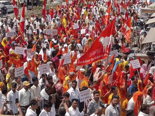 राजस्थान के अलग-अलग जिलों में आज गौ सम्मान आह्वान अभियान महारैली निकली गई। इस दौरान सीकर में करीब 40 डिग्री तापमान के बीच साधु-संत नंगे पैर सड़कों पर चले। अजमेर में पांच गाय के बछड़ों को भी रैली में साथ लाया गया। उदयपुर में लोगों ने ढोल-मंजीरों की धुन पर भजन गाते हुए रैली निकाली। अलवर में भी 21 हजार लोगों ने रैली निकाली। दरअसल, गोमाता राष्ट्रमाता का दर्जा दिलाने के लिए आज पूरे देश में कलेक्टर और तहसीलदार को राष्ट्रपति, प्रधानमंत्री व राज्यपाल के नाम ज्ञापन दिया गया। सीकर में 2.5 किलोमीटर की रैली निकाली सीकर में रामलीला मैदान से रैली शुरू हुई। जो कल्याण धाम, घंटाघर, जाटिया बाजार, तापड़िया बगीची, कल्याण सर्किल होकर कलेक्ट्रेट तक पहुंची। रैली के दौरान सीकर का तापमान करीब 40 डिग्री रहा। साधु-संत करीब 2.5 किलोमीटर नंगे पैर चले। गोवंश संरक्षण के नारे लगाए गए। कलेक्ट्रेट पहुंचकर हनुमान चालीसा का पाठ किया गया। रैली में शामिल साधु-संतों और सामाजिक संगठनों के प्रतिनिधियों ने जिला कलेक्टर को ज्ञापन सौंपा। ज्ञापन के जरिए गोवंश की हत्या पर फांसी देने और गाय को राष्ट्रीय माता का दर्जा देने की मांग की गई। सीकर की गौ सम्मान आह्वान रैली में 42 गांवों के लोग शामिल हुए। सीकर में ज्ञापन के साथ 31 हजार हस्ताक्षर का पत्र भी कलेक्टर को सौंपा। कल्याण धाम के महंत विष्णु प्रसाद शर्मा ने कहा कि गौ सम्मान आह्वान अभियान तब तक चलेगा, जब तक देश में गायों की रक्षा, सुरक्षा, सम्मान, अनुदान सुनिश्चित नहीं हो जाता। महाराज बोले- हम आगे नहीं आएंगे तो जनरल स्टोर पर मांस बिकेगा रैली में शामिल दिनेशगिरी महाराज ने कहा- गाय के लिए हम आगे नहीं आएंगे तो जनरल स्टोर की दुकानों पर मांस बिकेगा। सीकर रैली संयोजक चंद्रमादास महाराज ने कहा- सीकर में आज गोवंश के संरक्षण व संवर्द्धन के लिए गौ सम्मान दिवस मनाया गया। गोमाता राष्ट्रमाता का दर्जा दिलाने के लिए आज पूरे देश में कलेक्टर और तहसीलदार को राष्ट्रपति, प्रधानमंत्री व राज्यपाल के नाम ज्ञापन दिया गया। अजमेर में बछड़े लेकर पहुंचे साधु-संत अजमेर में भी रैली निकालकर विरोध प्रदर्शन किया गया। रैली शहर के विभिन्न मार्गों से गुजरते हुए कलेक्ट्रेट पहुंची। याहां प्रदर्शनकारियों ने हाथों में तख्तियां लेकर सरकार के खिलाफ नाराजगी जताई। प्रदर्शन के दौरान पांच गाय के बछड़ों को भी साथ लाया गया। इससे गोवंश की स्थिति को लेकर प्रतीकात्मक संदेश दिया गया। प्रदर्शनकारियों ने “गो सम्मान आह्वान अभियान” के तहत राष्ट्रपति, प्रधानमंत्री और मुख्यमंत्री के नाम ज्ञापन सौंपा। अजमेर शहर में चलाए गए हस्ताक्षर अभियान में करीब 13 हजार लोगों ने समर्थन दिया। इन हस्ताक्षरों की पोटली भी ज्ञापन के साथ प्र
