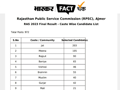 राजस्थान लोक सेवा आयोग (RPSC) ने 15 अक्टूबर को RAS-2023 भर्ती परीक्षा का रिजल्ट जारी किया था। रिजल्ट के बाद सोशल मीडिया पर एक पोस्ट में दावा किया जा रहा है कि RPSC ने चयनित अभ्यर्थियों की जातिवार संख्या साझा की है। पोस्ट के अनुसार, कुल 972 पदों के लिए जाति वार चयनित उम्मीदवारों की एक सूची जारी की गई है, जिसमें विभिन्न समाज-समुदाय के उम्मीदवारों की संख्या दी गई है। इस सूची के अनुसार, जाट समाज से 203 उम्मीदवार, मीणा समाज से 105 उम्मीदवार, राजपूत समाज से 90 उम्मीदवार, बनिया (जैन) समाज से 65 उम्मीदवार चयनित हुए हैं। इसी तरह विश्नोई समाज से 46 उम्मीदवार, ब्राह्मण समाज से 55 उम्मीदवार, मुस्लिम समुदाय से 40 उम्मीदवार, गुर्जर समाज से 42 उम्मीदवार, माली समाज से 21 उम्मीदवार, कुम्हार समाज से 25 उम्मीदवार, भील समाज से 10 उम्मीदवार, दलित/SC समाज से 169 उम्मीदवार और अन्य समाजों से 101 उम्मीदवार चयनित हुए हैं। सबसे पहले देखिए सोशल मीडिया पर शेयर पोस्ट… दावे की हकीकत: क्या है इस पोस्ट का सच?