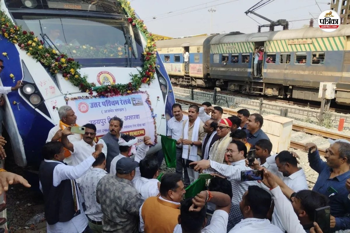Vande Bharat Express Train : वागड़ अंचल के लिए ऐतिहासिक पल तब आया जब सोमवार दोपहर 2 बजे बहुप्रतीक्षित वंदे भारत एक्सप्रेस ने डूंगरपुर रेलवे स्टेशन पर दस्तक दी। ट्रेन के स्वागत के लिए स्टेशन पर जनसैलाब उमड़ पड़ा और पूरा परिसर उत्सव के माहौल में डूब गया। करीब 6 मिनट ट्रेन रूकी। इस दौरान स्टेशन वंदे मातरम के जयकारों से गूंज उठा।